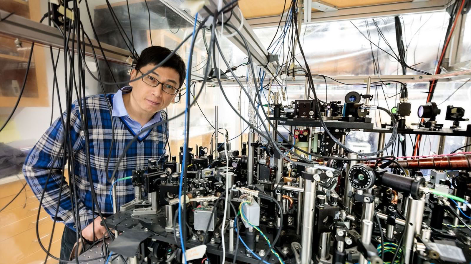 Cheng Chin poses with the apparatus used to trap cesium atoms and convert them to cesium molecules. The physicist has spent more than 20 years on a quest to demonstrate quantum superchemistry in the lab; last year, he finally did it. (Image credit: Photo by John Zich/University of Chicago)